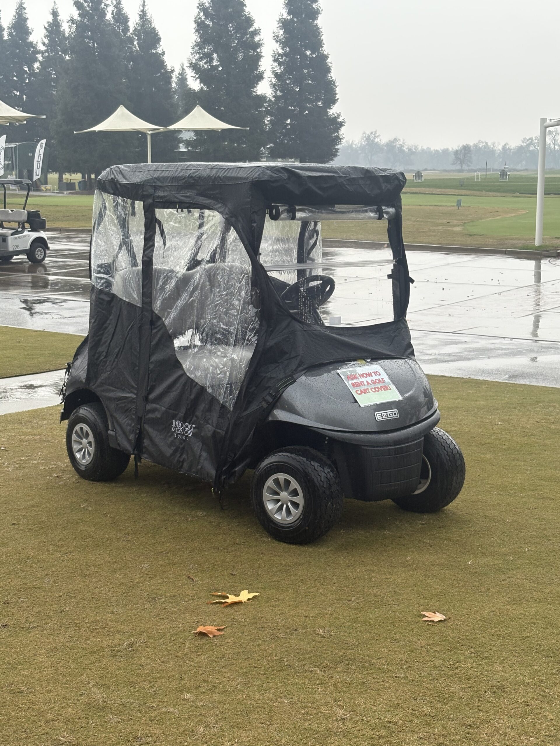 Stay dry in the rain or warm in the cold with our brand new cart covers! The next time you are at the golf course, ask a staff member how to rent a cart cover!
